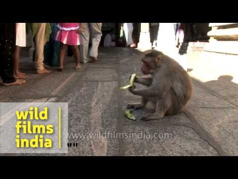 Fat monkey eating a banana while sitting on the ground. A crowd watches as the monkey peels the banana... Now talk of simian ...